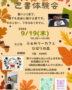 『己書体験会開催』のお知らせ●9/19(木)カフェ ひばりの森10:30〜15:00体験料:¥500筆ペン貸し出しいたします2回目以降は購入してください※己書体験の前後でランチまたはドリンクの1オーダーをお願い致しますのびのび楽しく己書を描いてみよう🖌️字や絵が下手でも大丈夫︎ファミリーカフェ ひばりの森座間市ひばりヶ丘2-39-14︎定休日 水、日、祝日#己書#己書体験会#座間初開催#座間市#筆ペンアート#筆文字#癒しの書#カッコいい書#さにぃ道場#sunny_onoresho#誰でもOK#やってみよう#出会い#新発見#習い事#趣味#友達作り#プレゼント#お祝い for Instagram