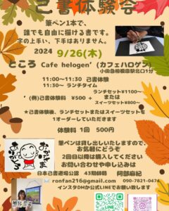 『己書体験会開催』のお知らせ●9/26(木)カフェ halogen(ハロゲン)11:00〜11:30 己書体験11:30〜ランチタイム体験料:¥500+ランチセット¥1100〜🟫己書体験後、ご一緒にランチして楽しみましょう※入店したら、先にランチメニューを決めてお支払いください ランチメニュー、オーダー制となっております筆ペン貸し出しいたします2回目以降は購入してくださいのびのび楽しく己書を描いてみよう🖌️字や絵が下手でも大丈夫🟫お問い合わせや申し込みはインスタDMか公式LINEでお願い致します一般社団法人/日本己書道場公認師範 さにぃ道場 阿部麻紀︎cafe halogen(カフェハロゲン)小田急相模原駅北口2-3分座間市相模が丘1-25-1リビオタワー小田急相模原コモンズざま3F座間市立市民交流プラザ プラッとざま内042-705-3135 ︎営業時間 月、火 10:00〜18:00水、木、金、土、日 10:00〜17:00︎定休日 第一火曜日#己書#己書体験会#座間初開催#座間市#筆ペンアート#筆文字#癒しの書#カッコいい書#さにぃ道場#sunny_onoresho#誰でもOK#やってみよう#出会い#新発見#習い事#趣味#友達作り#プレゼント#お祝い for Instagram