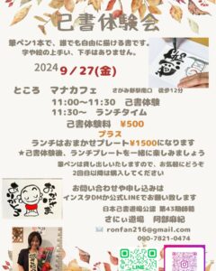 『己書体験会開催』のお知らせ●9/27(金)Mana cafe(マナカフェ)11:00〜11:30 己書体験11:30〜ランチタイム体験料:¥500+ランチプレート¥1500🟫己書体験後、ご一緒にランチして楽しみましょう ランチはおまかせプレート、オーダー制となっております筆ペン貸し出しいたします2回目以降は購入してくださいのびのび楽しく己書を描いてみよう🖌️字や絵が下手でも大丈夫🟫お問い合わせや申し込みはインスタDMか公式LINEでお願い致します一般社団法人/日本己書道場公認師範 さにぃ道場 阿部麻紀︎Mana cafe(マナカフェ)相鉄線かしわ台駅東口8分 さがみ野駅南口12分綾瀬市大上3-24-120467-84-8751︎営業時間 11:00〜19:00︎定休日 月、火、水#己書#己書体験会#座間初開催#座間市#筆ペンアート#筆文字#癒しの書#カッコいい書#さにぃ道場#sunny_onoresho#誰でもOK#やってみよう#出会い#新発見#習い事#趣味#友達作り#プレゼント#お祝い for Instagram